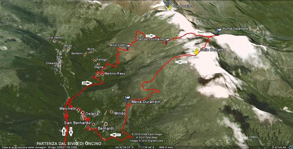 Partiti dal bivio di Oncino.Salire verso Crissolo fino a prendere il bivio per Ostana,dopo una ripida salita su asfalto andare verso Ciampagna .Poco dopo la borg.Raso si abbandona la strada principale a si sale a destra a borg. Martino ,di qui si prosegue su sterrato,ignorare il bivio per le baite Chiotti e dopo due lunghi traversi con modesta pendenza si arriva a Pian delle Fontaine.Di qui si continua a salire a piedi per 45 minuti circa senza piu' nessun sentiero spingendo la bici o portandola a spalle passando per Tampa Colletta ,arrivati in cresta,poco lontani dal colle Del Vallone sullo spartiacque tra val Pellice e val Po, andare a destra e salire a Punta Razil,poi dopo una discesa si affronta l'ultima salita sulle rocce con bici a spalla fino a Punta Ostanetta.Per il ritorno si intercetta un sentiero che passa a mezza costa senza piu'risalire a punta Razil, arrivati alla prateria si scende seguendo le tracce nell'erba e qualche ometto di pietra fino al Colle Bernardo.Di qua si scende a tratti in sella tutta la Costa Serviglione, fino a raggiungere la sterrata che porta all'alpe Durandini.Qui abbandonare la sterrata principale e svoltare a sinistra prima delle case,poco sotto parte un bellissimo sentiero tecnico ben segnalato e pulito che ci porta a Villa e San Bernardo,e si ritorna sulla strada fatta in salita ,scendere su asfalto fino al bivio di Oncino.